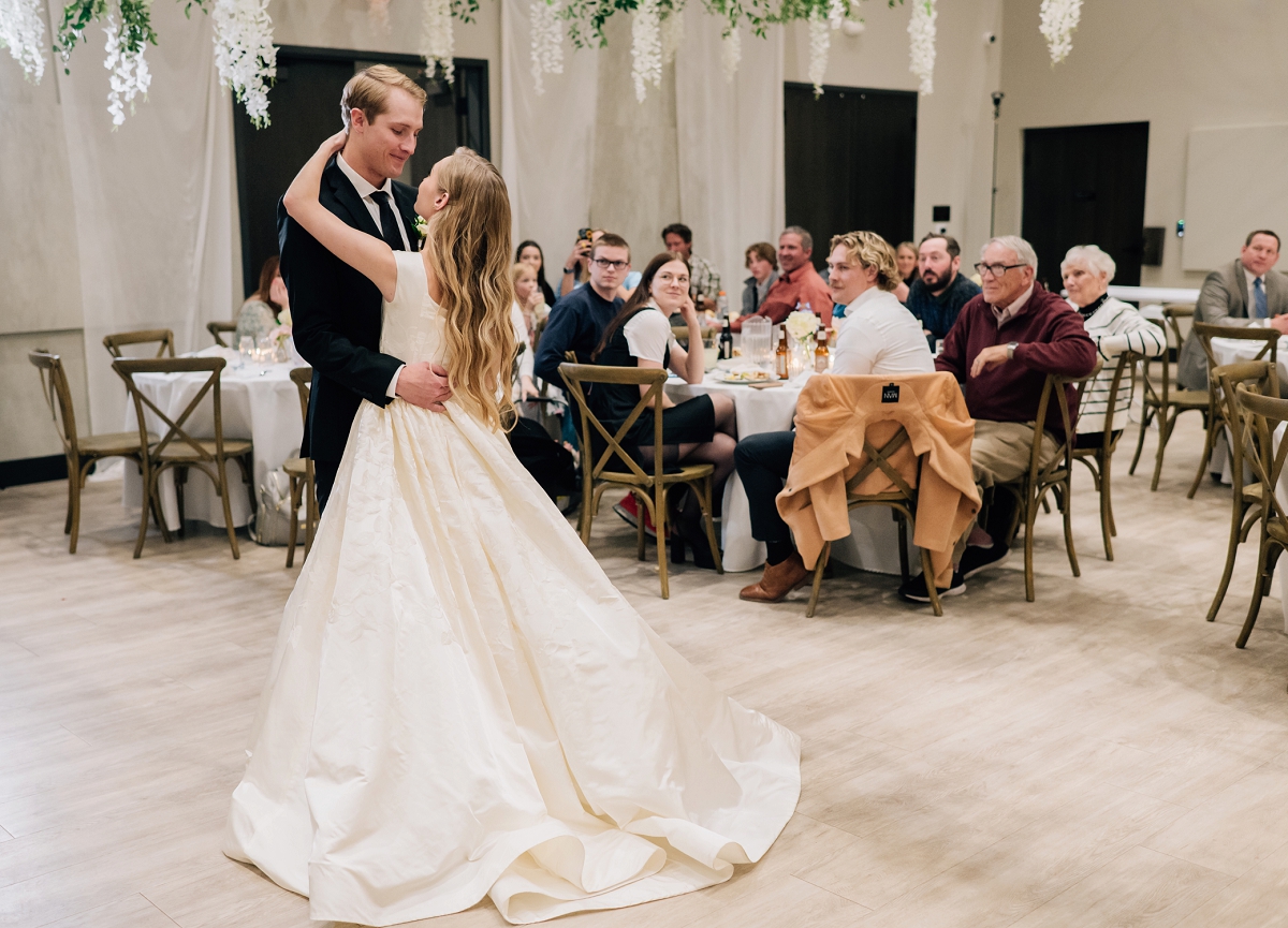 Their first dance felt like the whole room disappeared. He pulled her close, she wrapped her arm around his neck, and they just glowed. Guests watched with soft smiles and teary eyes as they swayed together — brand-new husband and wife, completely lost in their own little world.