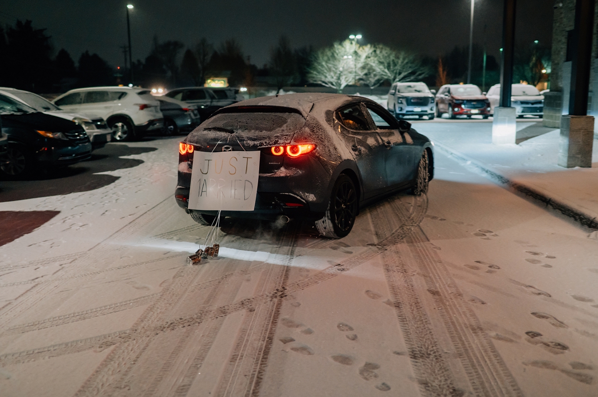 They slipped out into the snowy night with a “JUST MARRIED” sign, tin cans clinking behind them and happy tracks in fresh snow. No grand fuss — just two best friends, warm car heater on, heading off together toward forever.