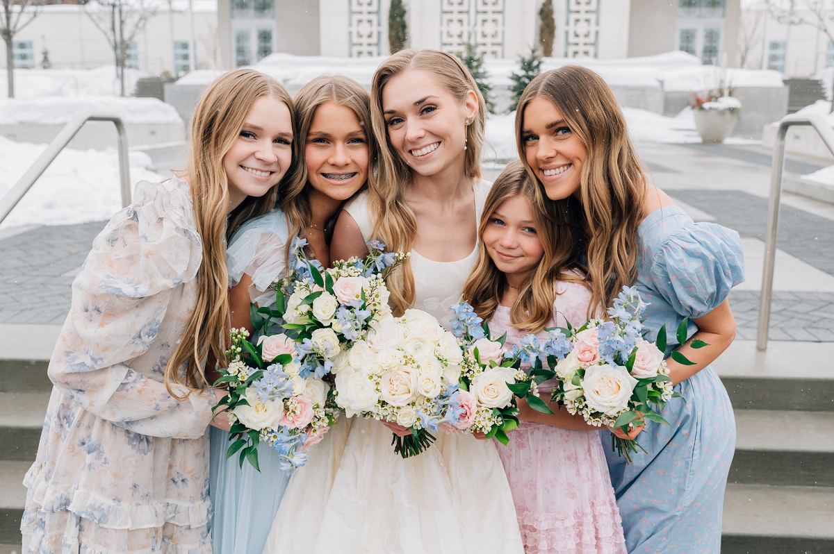 The bridesmaids gathered in close around Bailey, and it was one of those moments you wish you could bottle up forever. Light blue dresses, soft pastels, and rosy cheeks from the cold — but mostly? Smiles that came straight from the heart. The kind of friends who fix your veil, hold your bouquet, and cheer the loudest when you walk out of the temple as a wife.